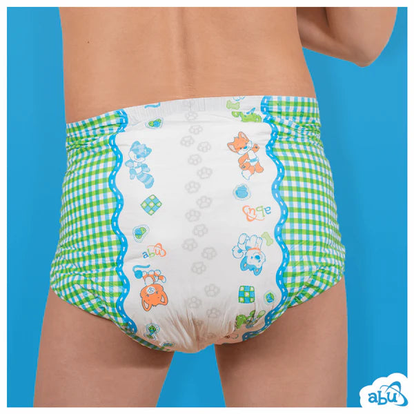 For the little animal in all of us, ABU presents the super fluffy-cute Little Pawz diapers! Whether you’re active and scruffy, or playful and primed for a show, this diaper has something for everyone who’s a fan of cute and fuzzy critters. Green and blue plaid accessory print surround playful-padded animal characters and toys for an all-over print made with cutie pups in mind!